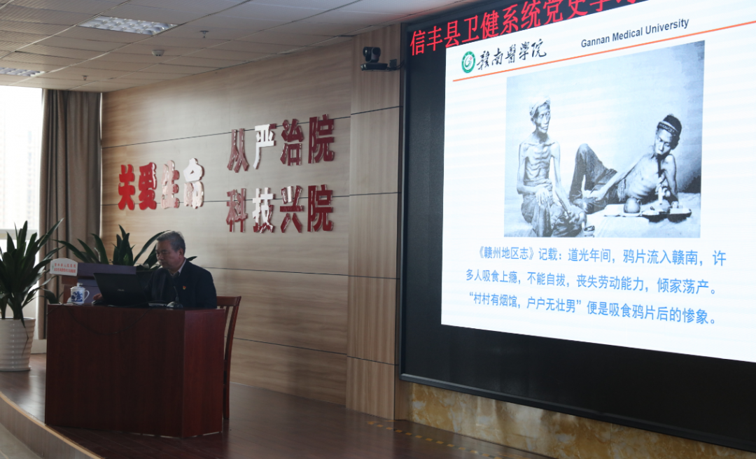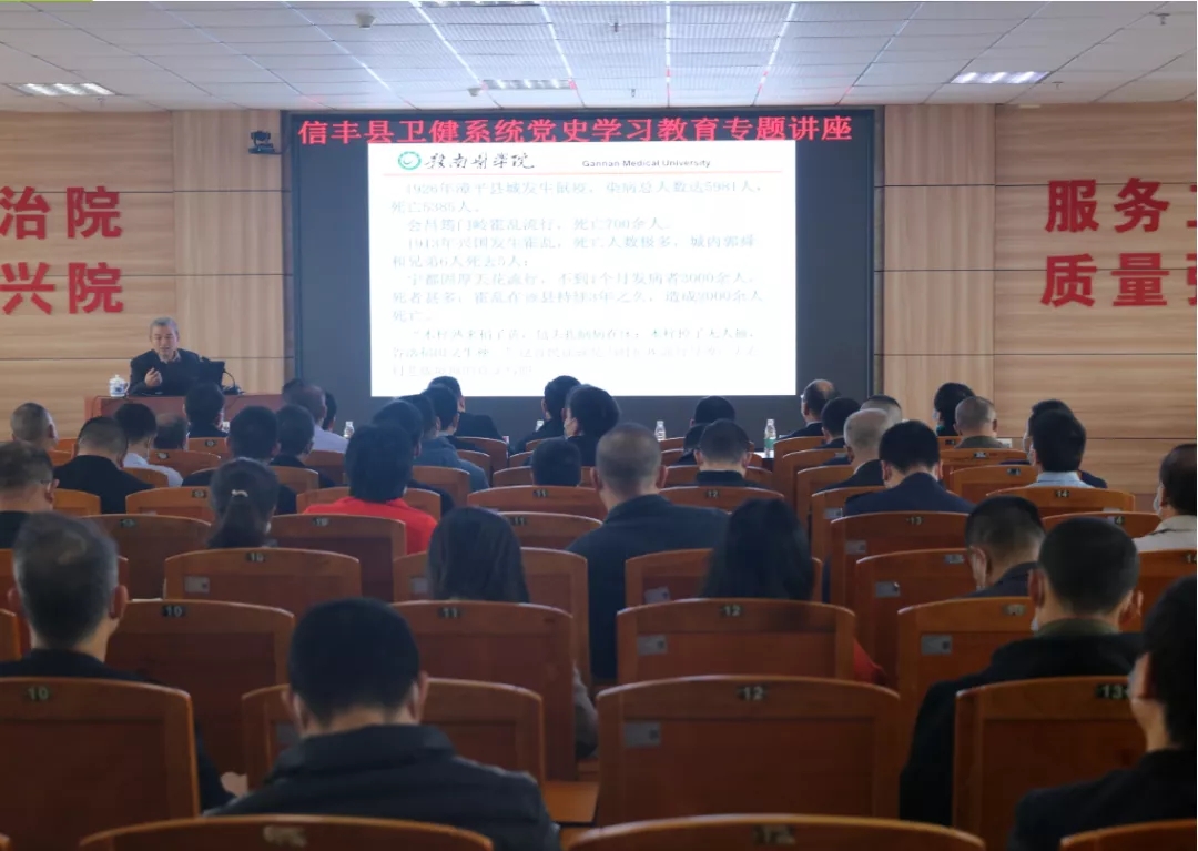 2021年4月8日,信丰县卫健委举办党史学习教育专题讲座,特邀赣南医学院教授、现任江西省哲学社会科学重点研究基地——中央苏区医疗卫生史与健康中国战略研究中心执行主任的刘善玖教授主讲。
