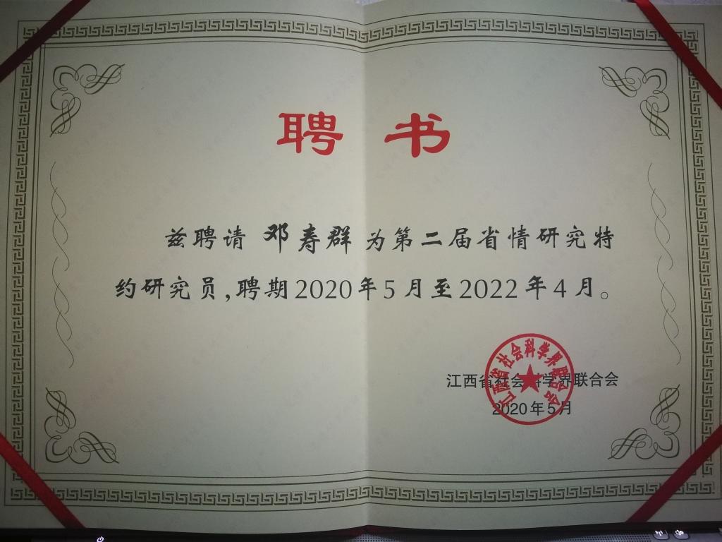 5月25日,从江西社会科学界联合会获悉,我校中央苏区医疗卫生史与健康中国战略研究中心邓寿群副教授被聘为“省情研究特约研究员”,成为我校首位受聘的“省情研究特聘专家”。