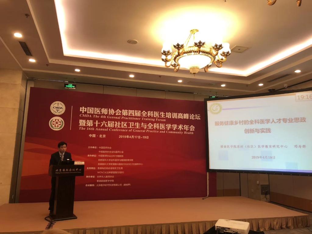 4月17-19日,由中国医师协会主办的“第四届全科医生培训高峰论坛暨第十六届社区卫生与全科医学学术年会”在北京国际会议中心顺利召开,我校承办了该年会的“订单定向免费医学生培养分论坛”,邓寿群受邀做《服务健康乡村的全科医学人才专业思政创新与实践》主题报告。